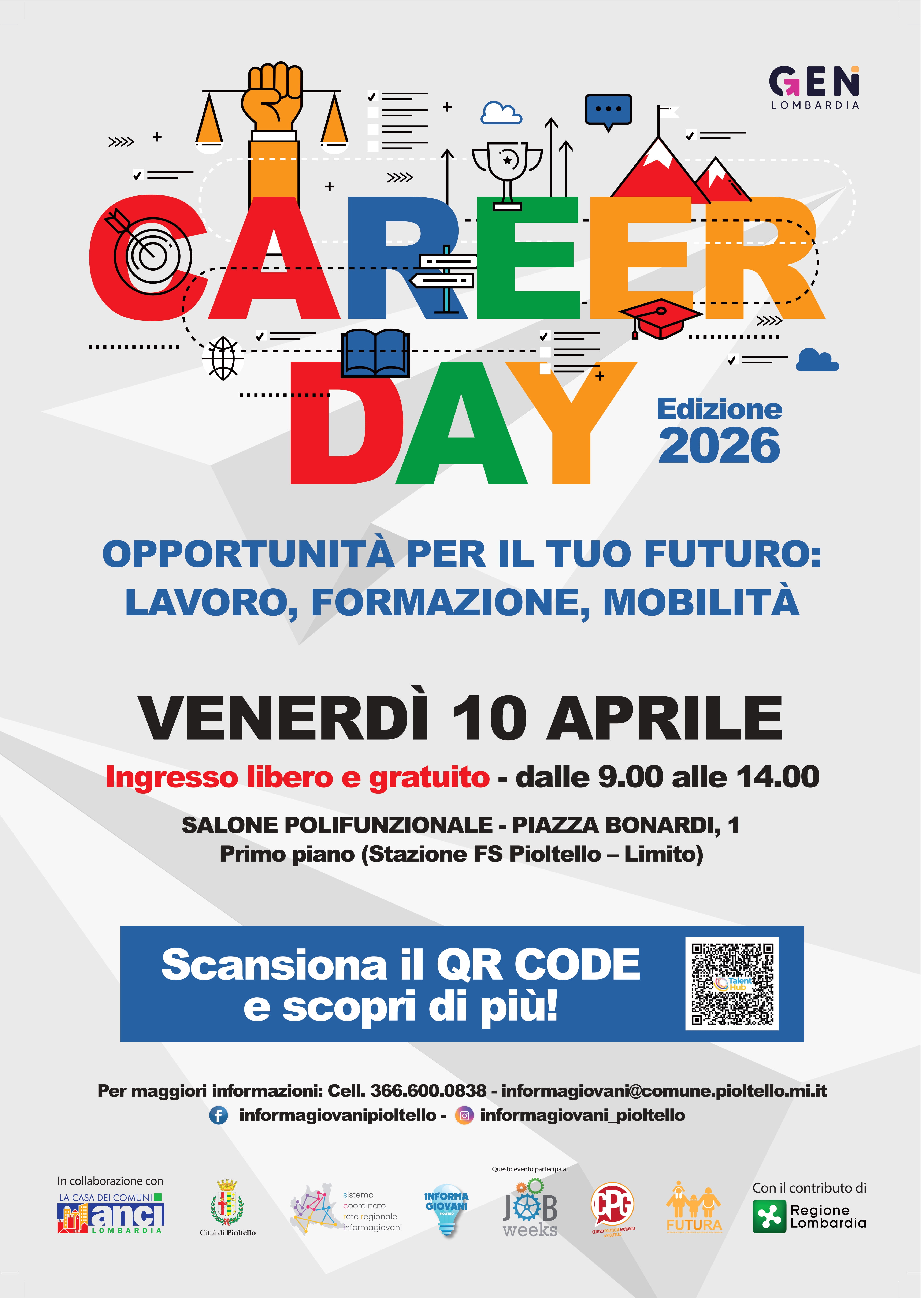 ll Career Day apre le porte venerdì 10 aprile 2026 dalle ore 9,00 alle ore 14.00 nel Salone Polifunzionale di Piazza Bonardi 1 - Pioltello.