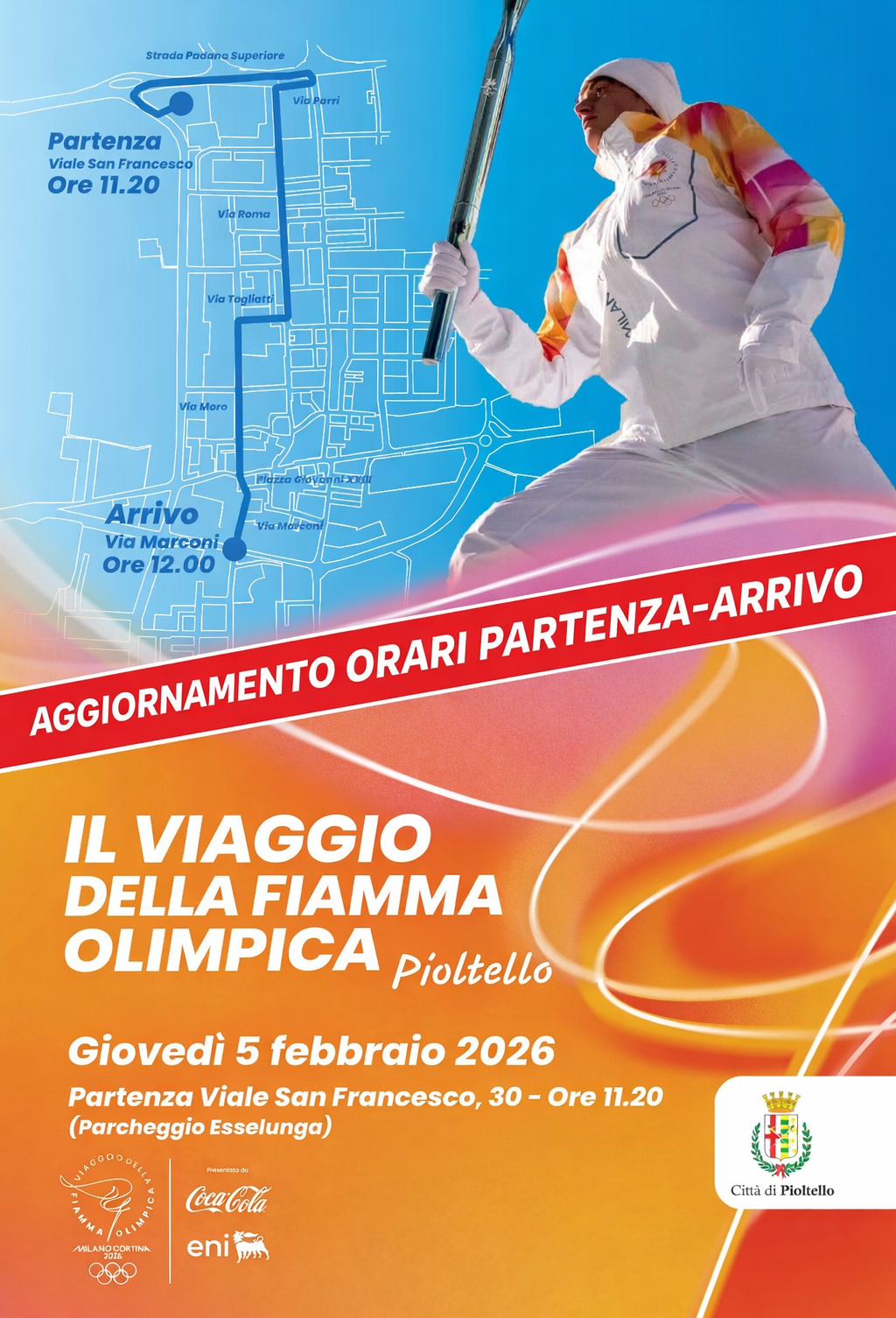 AGGIORNAMENTO ORARI: Il percorso dei tedofori e della carovana della Fiamma avrà inizio intorno alle 11.20 (e non più alle 11.40 come precedentemente comunicato) da viale San Francesco 30 per poi proseguire verso la Strada Padana Superiore, via Parri, via Roma, via Togliatti, via Aldo Moro, piazza Giovanni XXIII per finire poi in via Guglielmo Marconi intorno alle 12.00.